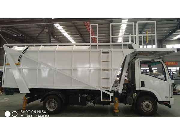 Este caminhão de lixo é composto de chassis, subestrutura , caixa de lixo, quadro de elevação do portão, plataforma, tanque de esgoto, sistema hidráulico e sistema de controle elétrico.
